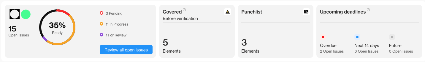 Total open issues. The count of all open observations under your company's role. For subcontractors, this means Pending + In Progress items in your assigned trades. For general contractors, it also includes Waiting for Review.