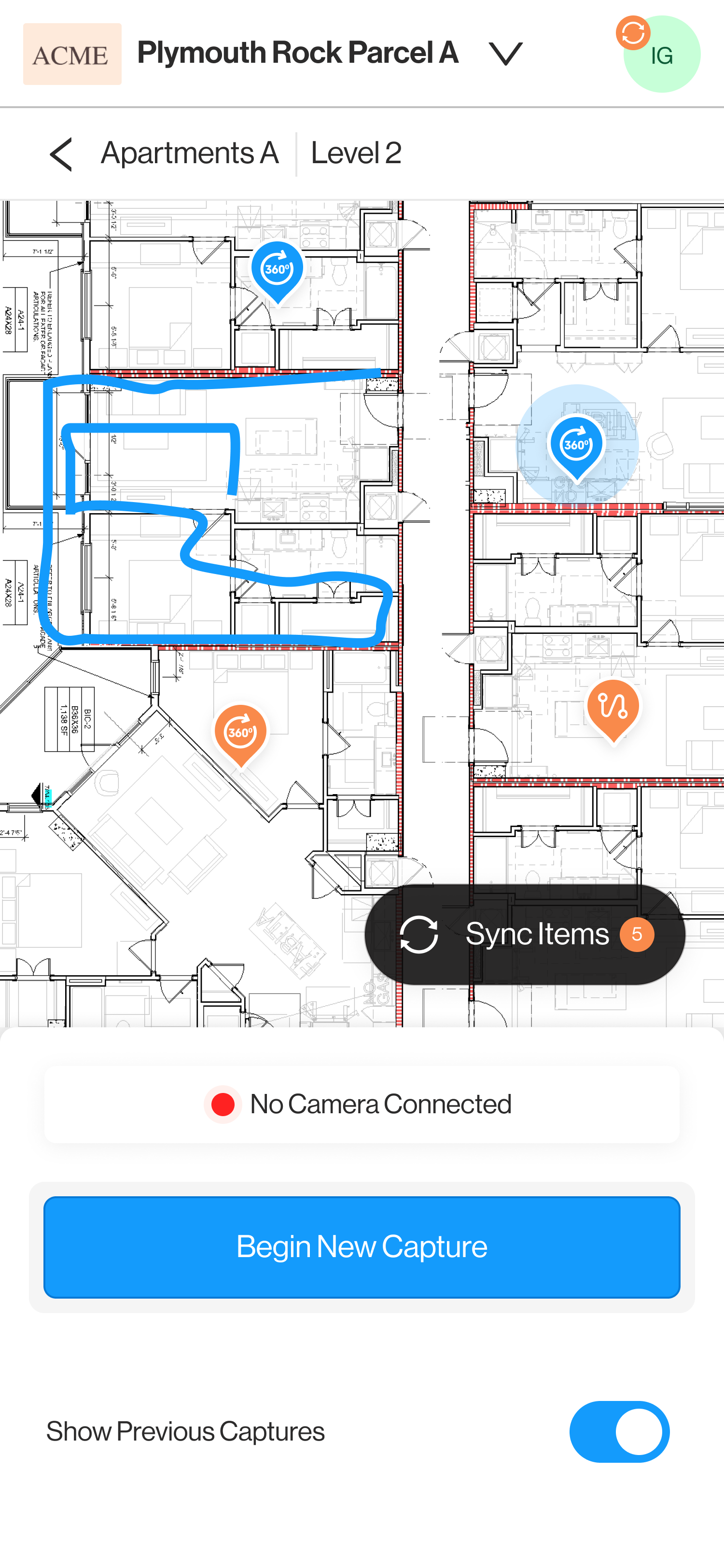 After completing any capture, the data will be sent to the Sync List for uploading. The sync list can be accessed by clicking on the Sync Items button or from the Avatar Menu. 💡 Captured Multiple Levels? When clicking on Sync Items, only the captures from the current level will be shown. To view all your captures, access the Sync List from the Avatar Menu |
